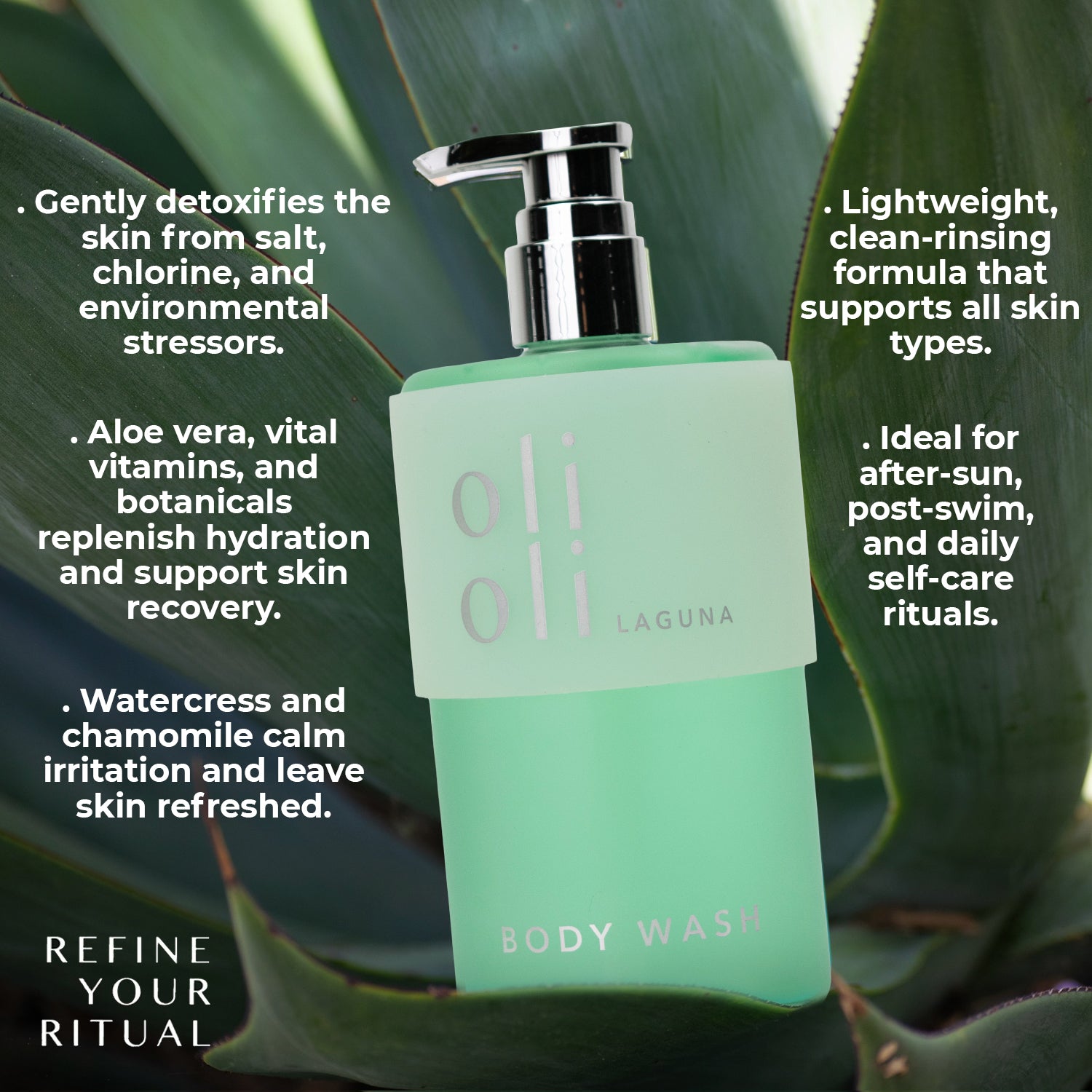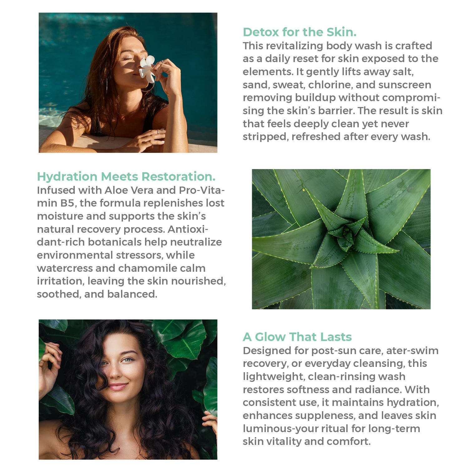 A skin-cleansing ritual with performance in mind. Formulated to gently lift away salt, sweat, sand, chlorine and sunscreen without disrupting the skin’s barrier. Infused with aloe, pro-vitamin B5, and antioxidant-rich botanicals to detoxify, soothe, and restore for a radiant, post-vacation glow.